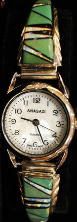 Native American Timepieces are a great way to commemorate the culture of the Southwest on a daily basis. Whether you like the petit point work of the Zuni, or the Navajo silver and stone look we have you covered. Cobblestone inlay gives you a full gem like look while the flat inlay a more modern flavor.